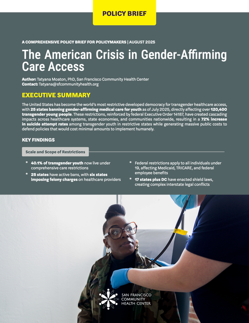 The American Crisis in Gender-Affirming Care Access is a comprehensive policy brief that examines the full scope of these restrictions: their legal mechanisms, public health impacts, economic inefficiencies, and standing in global human rights law. Grounded in data and driven by urgency, this report offers a roadmap for restoring access, protecting trans lives, and upholding healthcare as a human right.
